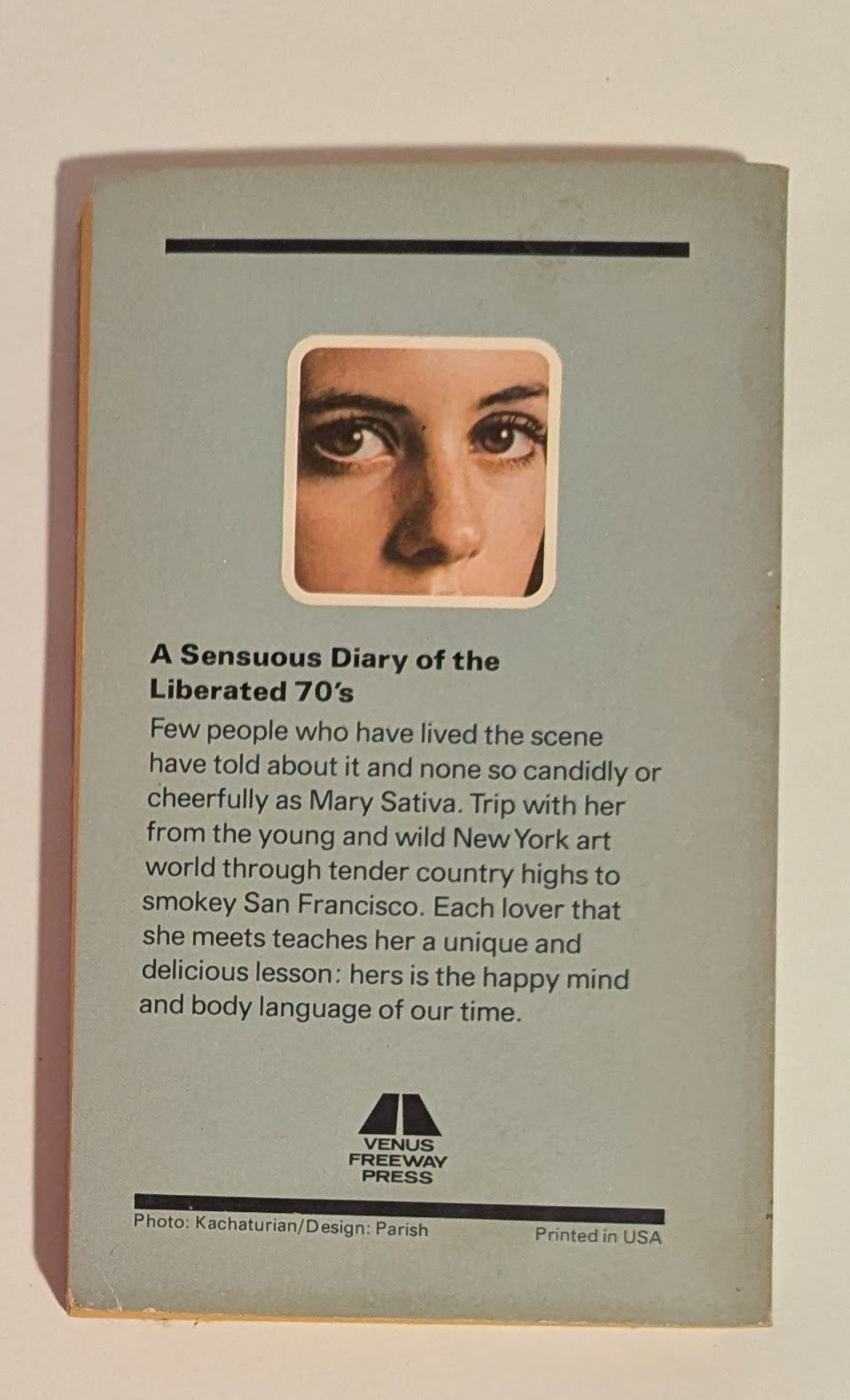 Not quite smut as much as a acid-drenched travelogue of the late 60s. Ms. Sativa recollects her journeys across the country, her lovers, trips, and good times. Rather fascinating study of true libertine lifestyles given the increasingly claustrophobic and sexless character of our day. Notable for also being a great name for a stoner metal band. Truly scarce and in demand, particularly for this much improved cover over the original 1969 edition. a genuinely cool book worth your time.