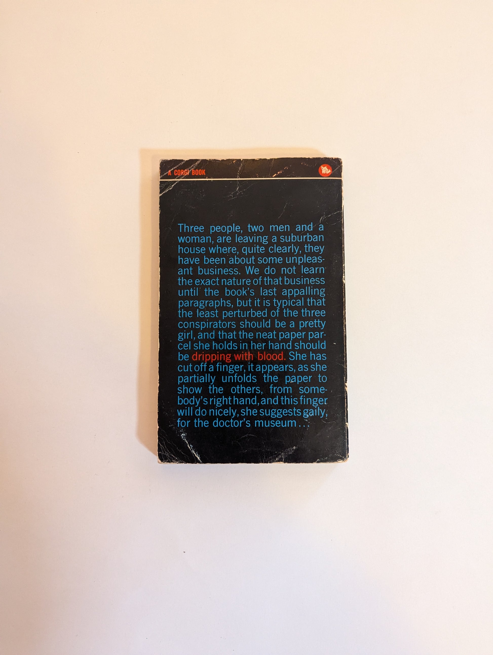 "Three people, two men and a woman, are leaving a suburban house where, quite clearly, they hve been about some unpleasant business. We do not learn the exact nature of that business until the book's last appalling paragraphs, but it is typical that the least perturbed of the three conspirators should be a pretty girl, and that the neat paper she holds in her hand should be dripping with blood. She has cut off a finger, it appears, as she partially unfolds the appear to show the others, from somebody's right hand, and this finger will do nicely, she suggests gaily, for the doctor's museum".