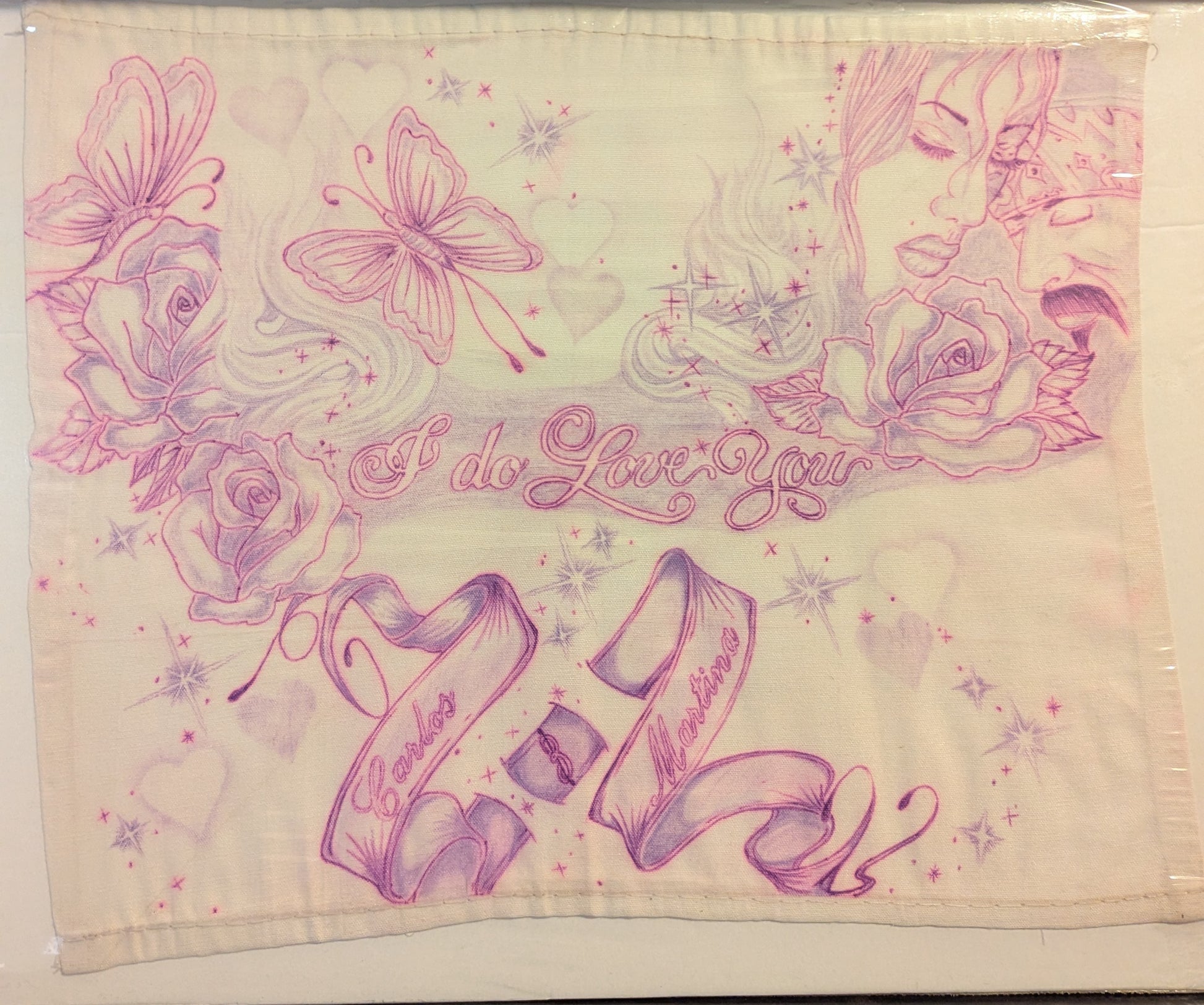 Paños are an art form unique to the American Southwest consisting of generally pen ink drawings on prison issued bed sheets and pillow cases. This beautiful piece, measuring approximately 12x10, wrapped to a piece of foam core, has the names "Carlos and Martina" in a lovely script, with the perennial message "I Do Love You" festooned with stars, butterflies, roses, and hearts. Enchanting stuff.