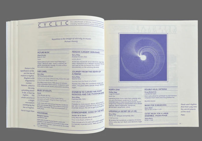 "Created and co-produced by Anna Turner and Stephen Hill (b. 1944, USA), Hearts of Space began airing on Sunday nights from 11pm to 2am on Berkeley, California's KPFA radio beginning in 1973. Nearly a decade into the program's run, Turner and Hill self-published The Hearts of Space Guide to Cosmic, Transcendent and Innerspace Music, an annotated introduction to the generous international sampling of music featured weekly on the program. The book's structure brings the nocturnal radio project into clear view, divided as it is into such "flexible/organic" categories as "ambient," "new age," "electronic space music," "cosmic rock," and many more. Shortly after the release of this guide, Hearts of Space was syndicated to 35 public radio stations through NPR; to date, there have been over 1,100 broadcasts of the program."
