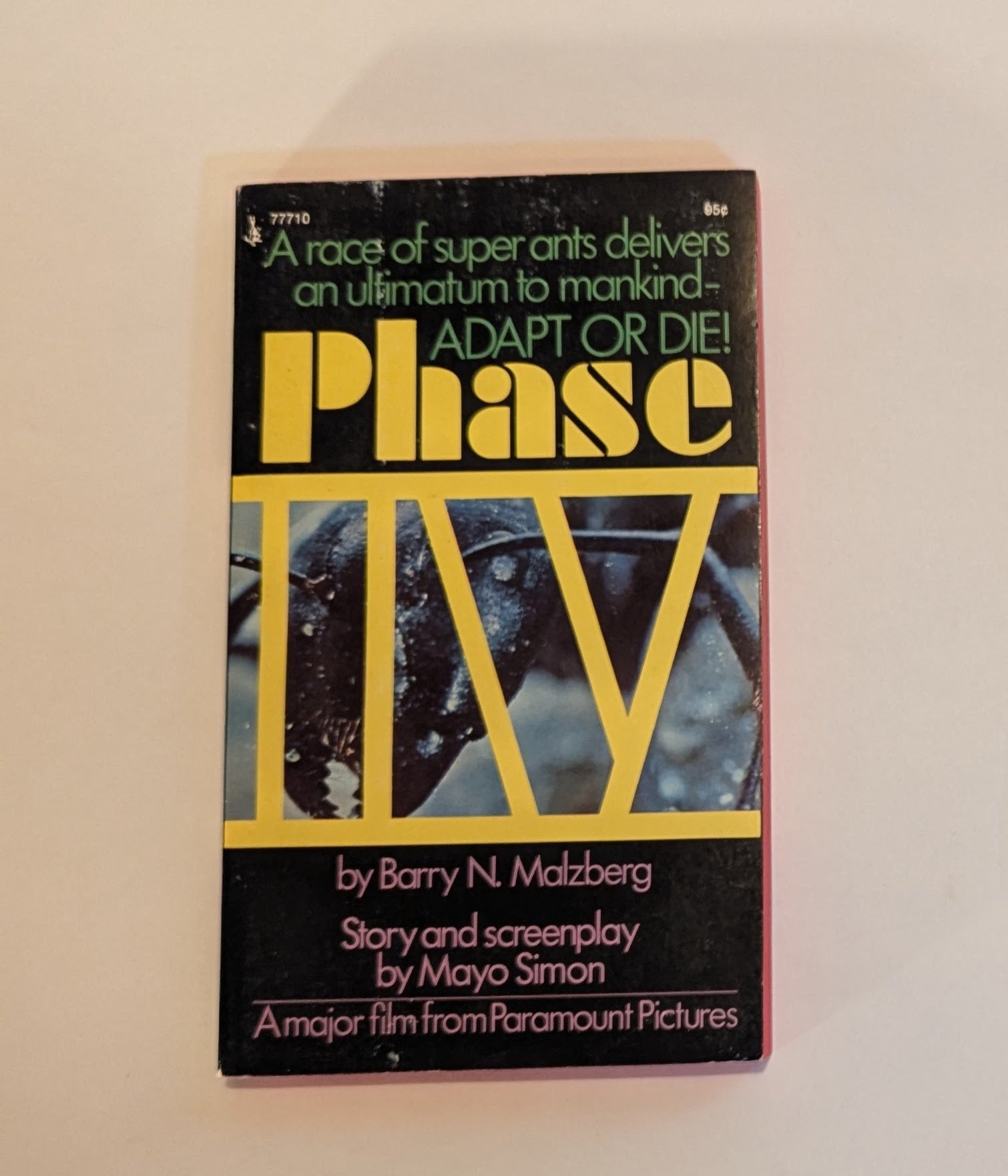 "Triumphant from a fifteen thousand year battle in space, a bolt of energy reached the third planet of a Class B star. A new life force spawned seven grey towers in the Arizona desert.Now, from out of their dark mysteries marches a new breed of killer ants to herald the dawn of Phase IV…In their path wait two men, a frightened girl and the resources of modern science. Mankind's first line of defense—and its last… Novelization based on a story and screenplay by Mayo Simon."