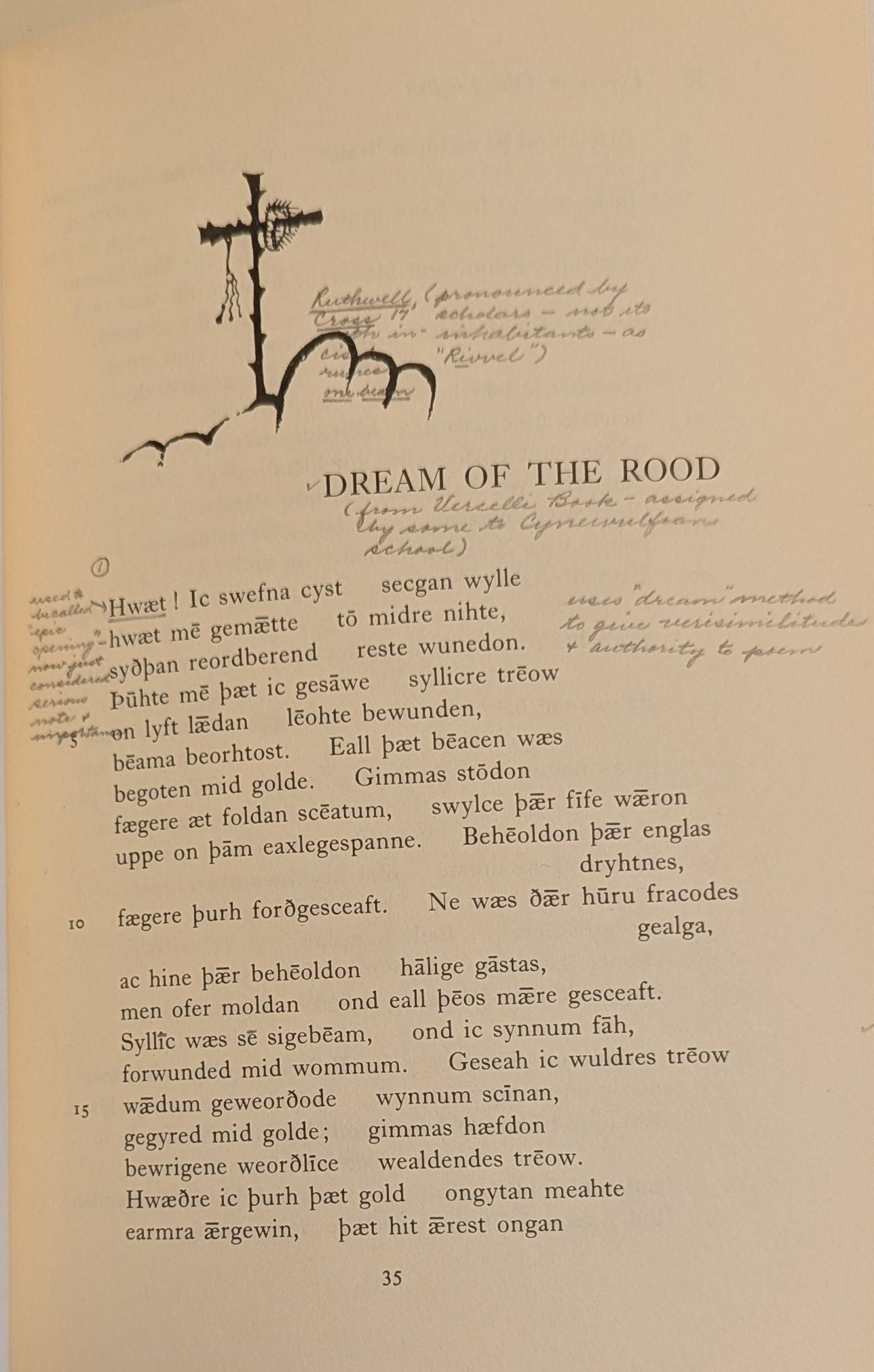 This is a truly lovely little study of old English poetry, with quite a nice layout. Illustrations throughout, illustrated endpapers, all hem in these deeply elegaic works of the dark ages.However, the selling point of this book is the absolutely lovely penciled in annotations by it's former owner. With a deft hand, she interrogates the beauty of these works with the enthusiasm of a scholar with the promise of tenure. This book is totemic - a rare work of literary white magic.