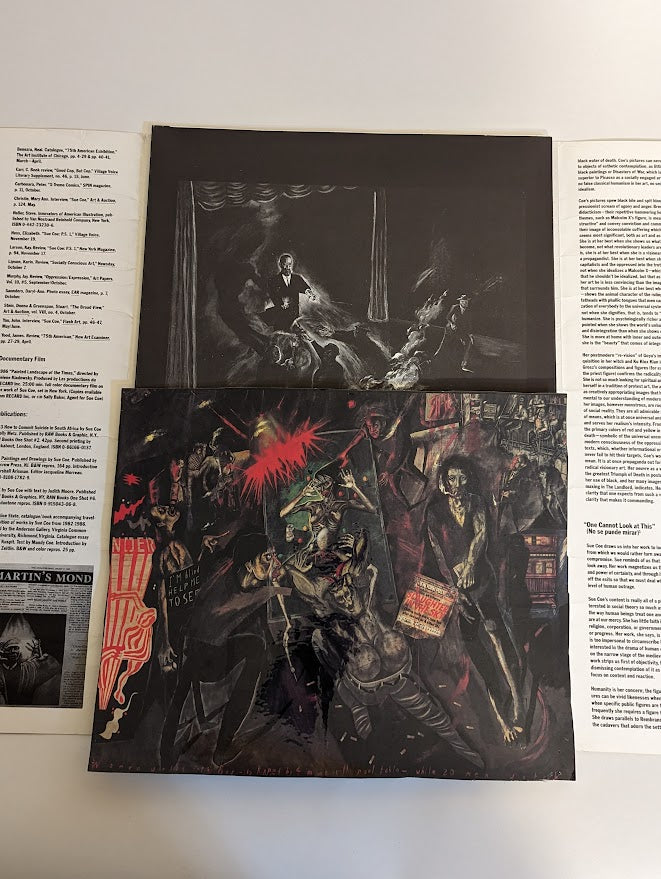 A phenomenal collection of artist Sue Coe’s morbid political art, presented in a massive (16x11) loose folio edition of 25 pages, each print with text on the inverse providing context for the pieces, including essays by Donald Kuspit, and Marilyn Zeitlin.