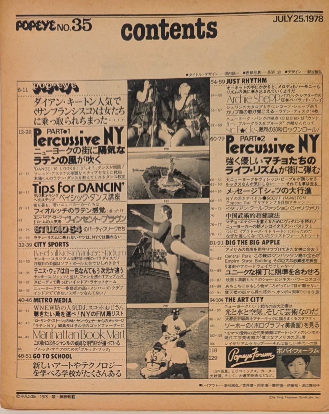 Popeye magazine is a long running "men's interest" (The Magazine for City Boys) periodical based out of Japan renowned for it's sumptuous photo spreads and deep dives into topics as broad as Ivy Style, to proper hamburgers, to BMX racing, and so on. This very early issue, in incredible condition, is an absolute grail in their long history given it's focus on "Percussive New York City". Including pieces such as: