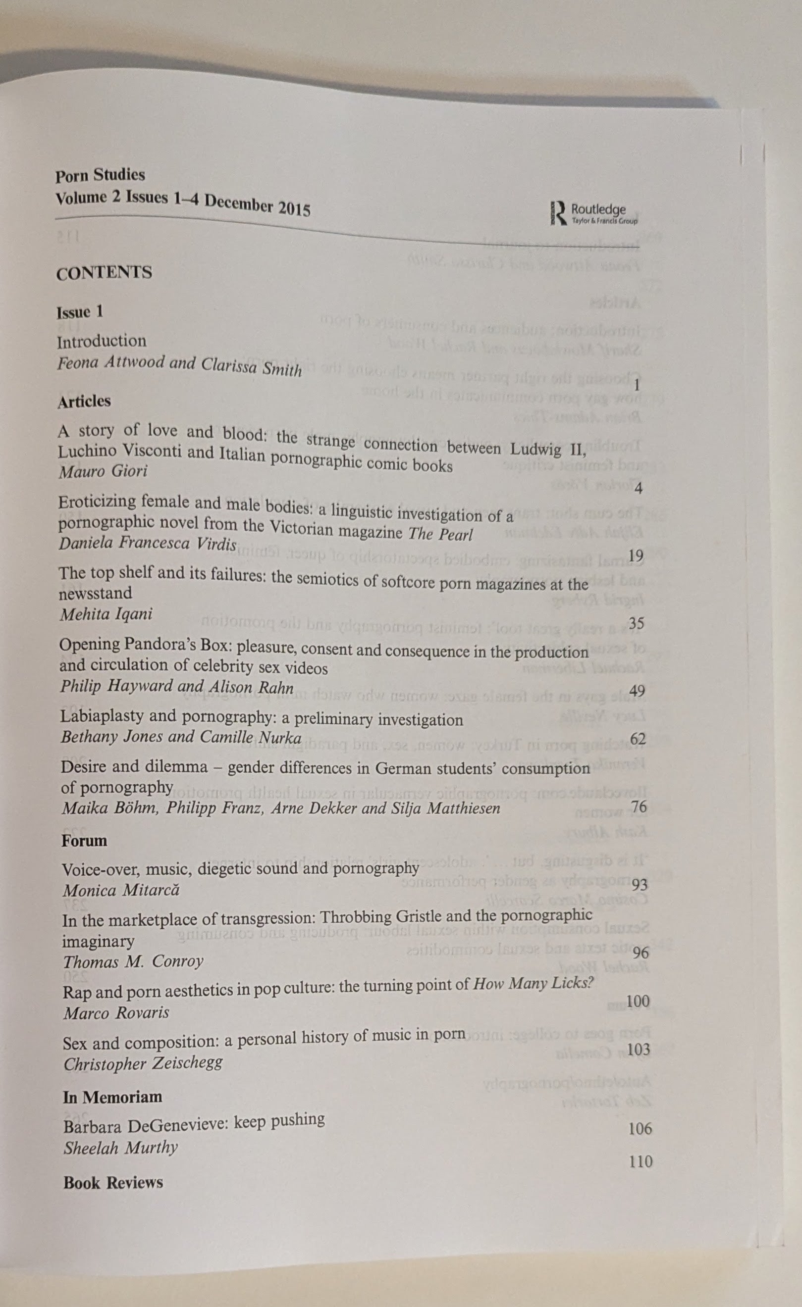 " Porn Studies is the first dedicated, international, peer-reviewed journal to critically explore those cultural products and services designated as pornographic and their cultural, economic, historical, institutional, legal and social contexts. Porn Studies will publish innovative work examining specifically sexual and explicit media forms, their connections to wider media landscapes and their links to the broader spheres of (sex) work across historical periods and national contexts."