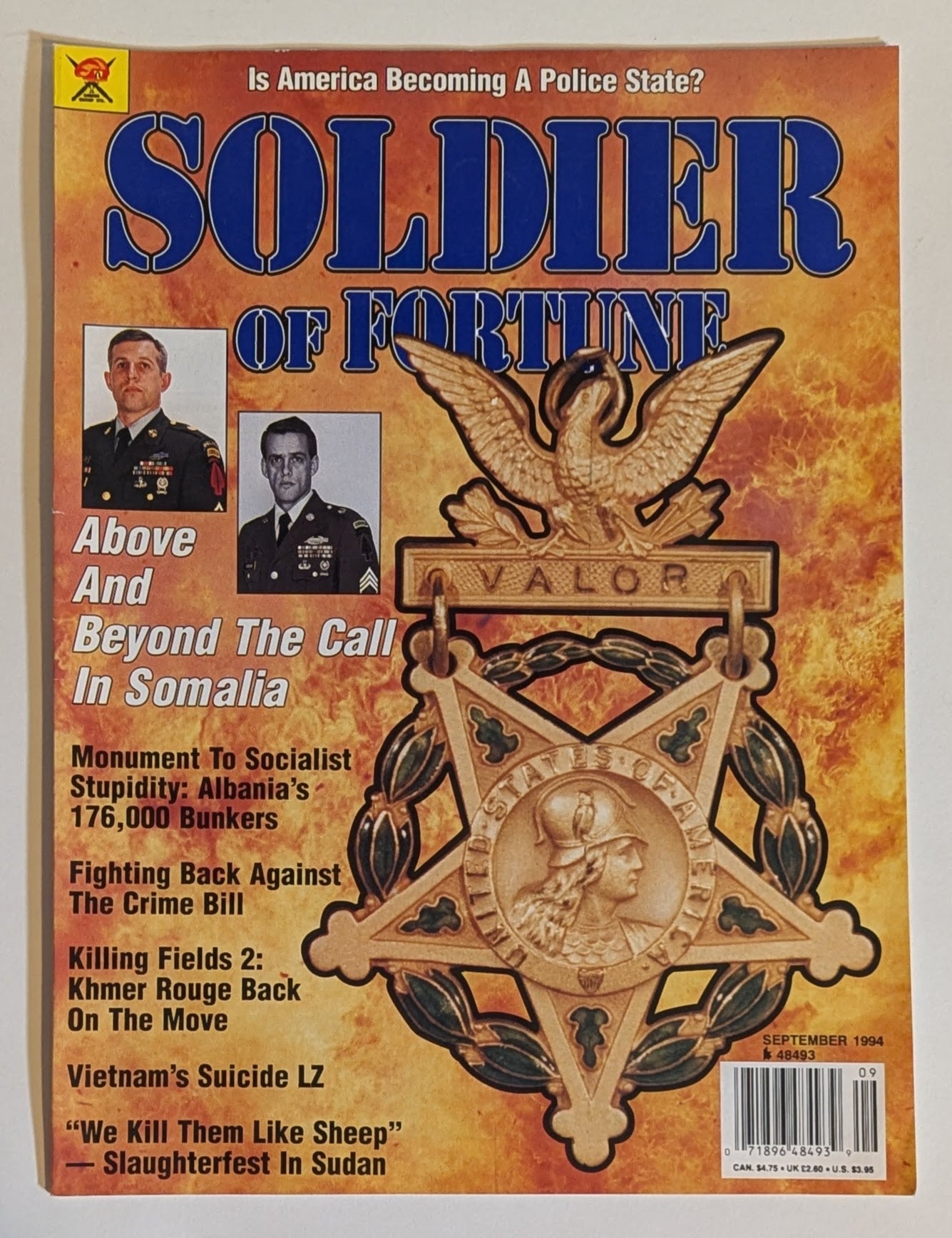 Soldier of Fortune, CO. 1994. Some sticker damage and crinkling to the rear page, otherwise very good.