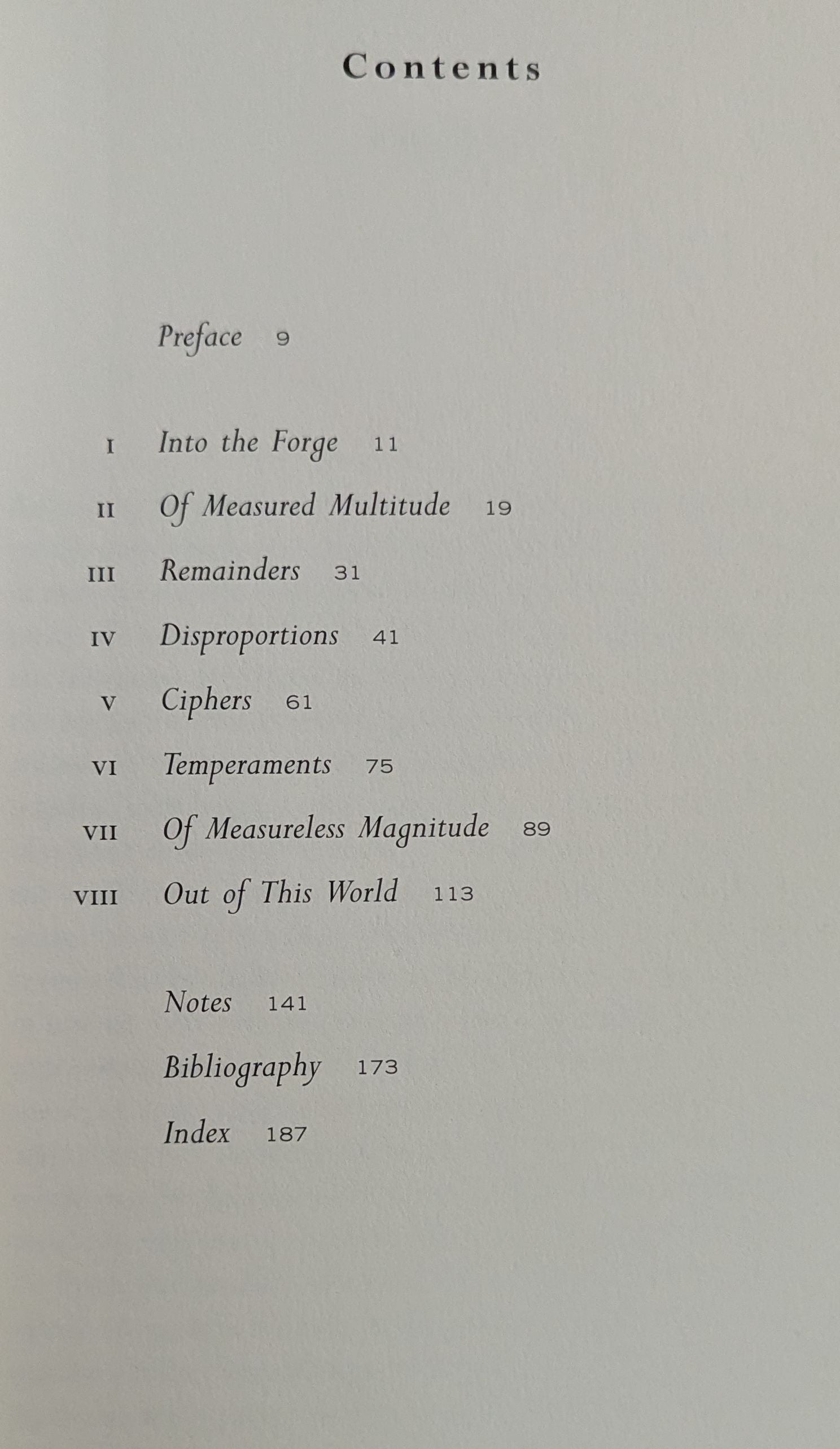 "An ancient tradition holds that Pythagoras invented harmony. It is said that one day, he wandered by a forge and, hearing a wondrous sound come from within, ventured in to investigate. He found five men hammering with five hammers. To his astonishment, he discovered that four of the five hammers stood in a marvelous set of proportions, which, when combined, allowed him to reconstruct the laws of music. But there was also a fifth hammer. Pythagoras saw and heard it, but he could not measure it; nor could he reason its discordant sound. He therefore discarded it.