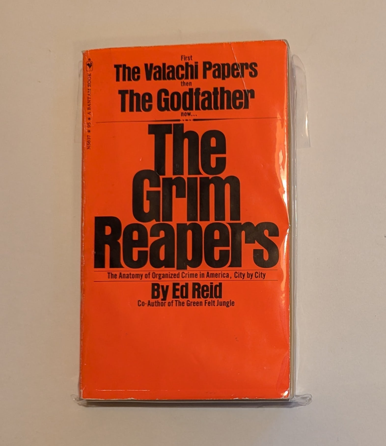"Corruption U.S.A. ~ From Boston and Detroit to Miami and New Orleans, from New York and Chicago to Los Angeles, reporter Ed Reid tears the lid off organized crime in America. The Grim Reapers gives you a frightening picture of the Mafia, its infiltration into legitimate business, and the insidious influence it exercises over the lives of unsuspecting citizens. Meet "The Family" ~ Ed Reid names names, places and dates. They're all here - all the big ones. Meet them in a special section, Phi Beta Mafia."