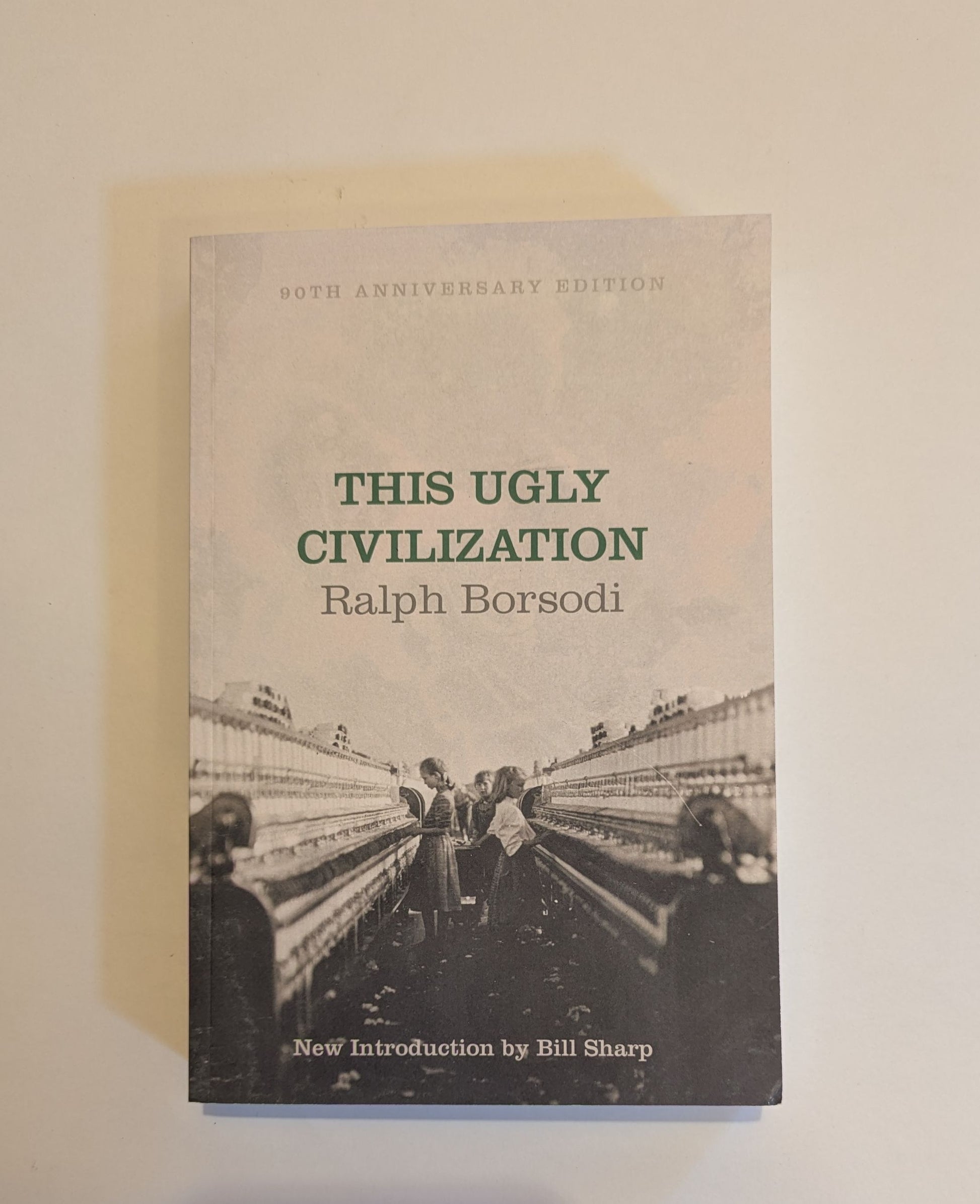 "There are three basic themes in Ralph Borsodi’s This Ugly Civilization: a critique of modern industrial civilization, achieving personal economic independence, and maximizing individual potential. Borsodi advocates a lifestyle of self-reliance and decentralized power, and outlines how it can be realized either by one man or by all. The logical steps are given for moving beyond a “victory garden” so that each of us may cultivate a human-scale existence compatible with nature and the pursuit of the good life. Received with great interest upon release in 1929, This Ugly Civilization offered a course of action for those who were soon facing the Great Depression. The book again found an audience during the rationing and instability of World War II. This Ugly Civilization and Borsodi’s subsequent Flight from the City (1933) became “bibles” to many in the successive “back-to-the-land” movements that occur every generation. His ideas gained further momentum among young people looking for answers in the 1960s and 70s. The indefatigable Mildred Loomis, the greatest advocate of Borsodi’s work, even garnered the nickname “grandmother of the counterculture.” Within another decade, the punk-inspired DIY movement would rail against centralizing authority and encourage the creation of a new culture of self-determination—although such radical ideas were hardly new, as Borsodi’s book shows."