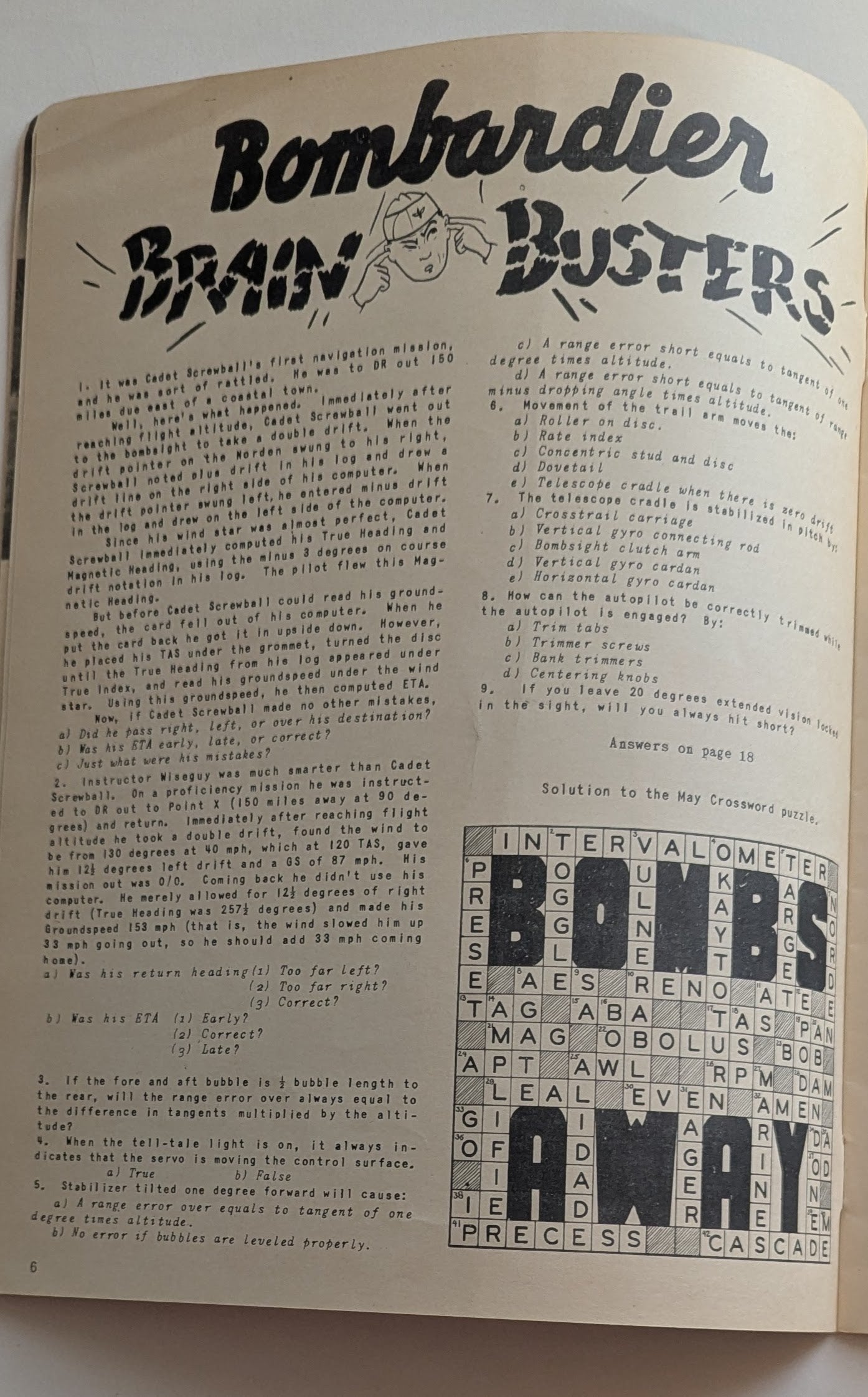 In this fascinating zine from the Air Force, we see the lighter side of of our bombardiers. with articles ranging from the deeply technical to lighter hearted pieces like "Bombardier Brain Busters". Amazing illustrations throughout. Exceedingly scarce...and restricted!